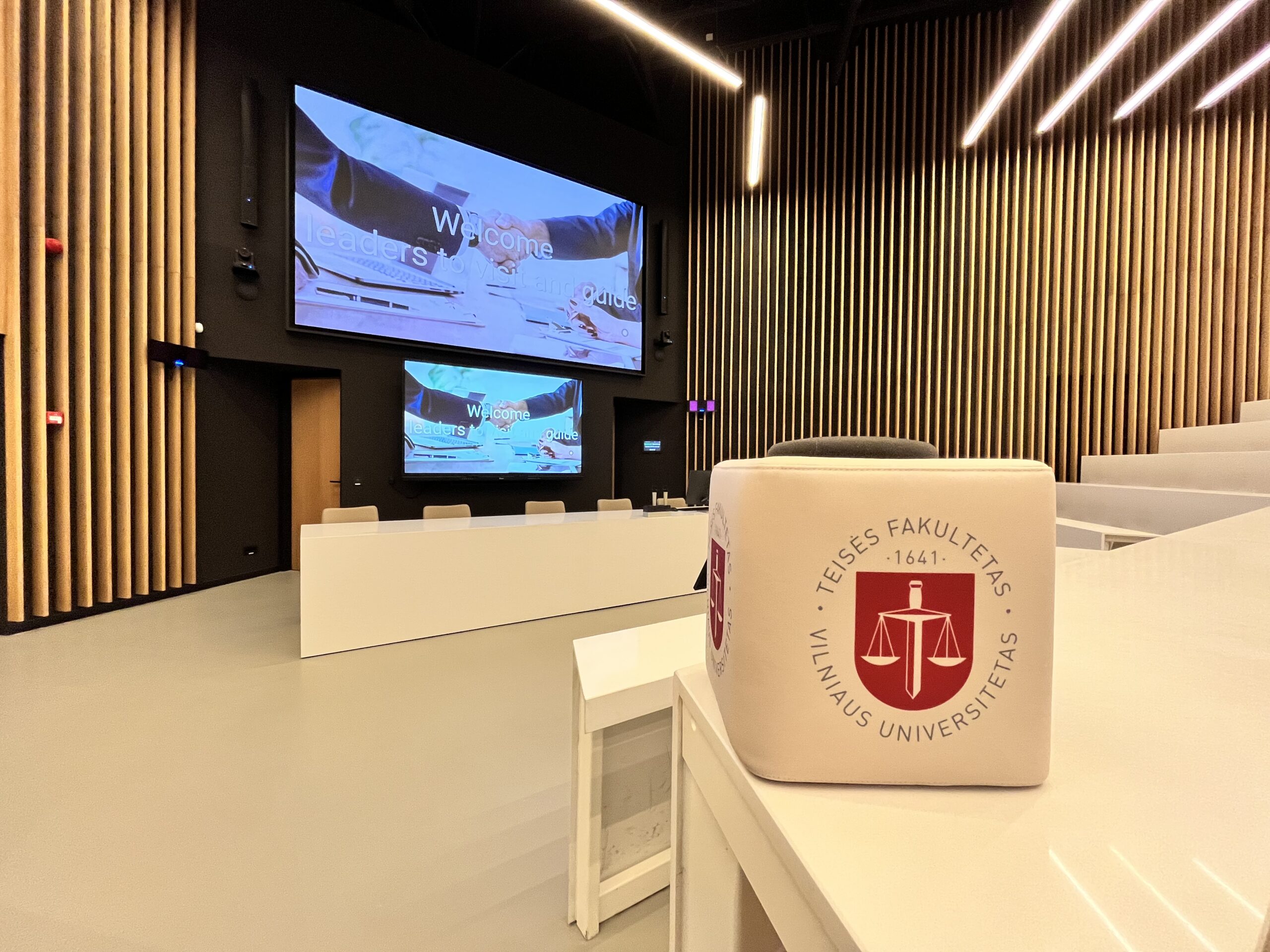 Modernizuota Vilniaus universiteto Teisės fakulteto auditorija, suprojektuota ir įgyvendinta kaip daugiafunkcinė erdvė šiuolaikinėms paskaitoms, tarptautinėms konferencijoms ir hibridiniams renginiams. Projekte